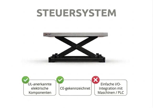 Diese Version beinhaltet ein integriertes Steuerungssystem sowie UL Recognized Komponenten. Der Hubtisch ist gemäß EN 1570-1:2024 CE-gekennzeichnet.