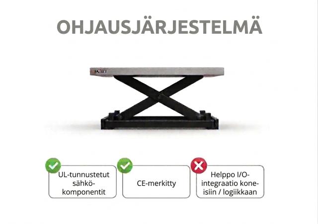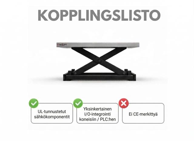 Tämä versio sisältää integroidun ohjausjärjestelmän ja UL Recognized -komponentit. Nostopöytä on CE-merkitty standardin EN 1570-1:2024 mukaisesti.