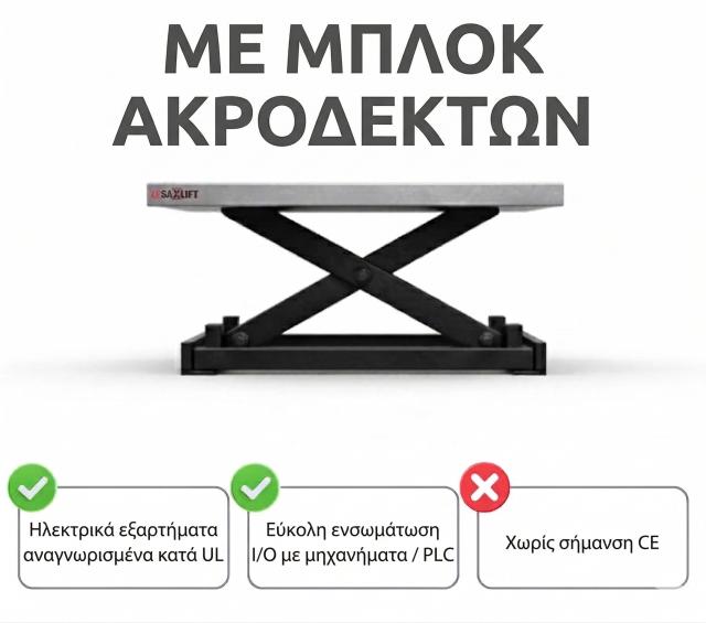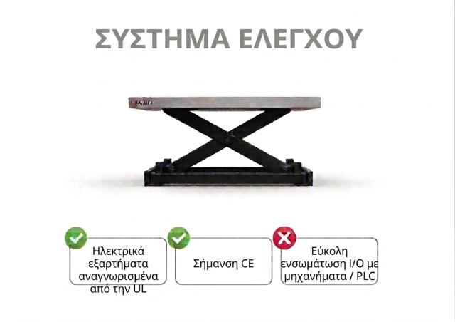 Το ανυψωτικό τραπέζι / κατασκευή δεν είναι UL Listed ως πλήρης μονάδα. Παραδίδεται ως λύση I/O χωρίς ενσωματωμένη λογική ελέγχου και πρέπει να ενσωματωθεί σε άλλη μηχανή ή PLC, όπου υλοποιείται η τελική λογική ελέγχου και τα συστήματα ασφαλείας.