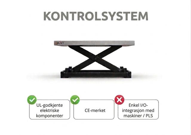 Denne versjonen inkluderer et innebygd styringssystem samt UL Recognized komponenter. Løftebordet er CE-merket i henhold til EN 1570-1:2024.