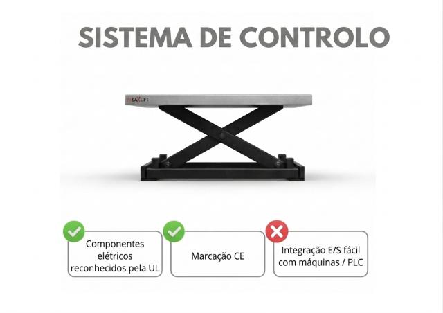 Esta versão inclui um sistema de controlo integrado e componentes UL Recognized. A mesa elevatória é marcada CE de acordo com a norma EN 1570-1:2024.