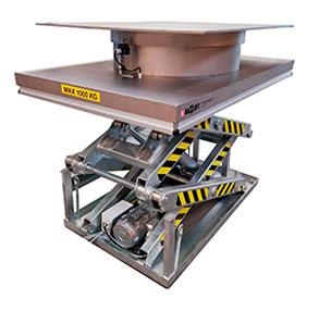 Sowohl der Bodenrahmen als auch die Schere dieses Hubtisches sind feuerverzinkt. Der obere Teil macht den Hubtisch einzigartig – die Plattform besteht aus Edelstahl AISI316 und der Drehteller-Turm ist ebenfalls vollständig mit Edelstahl AISI316 verkleidet. Die Drehfunktion läuft automatisch über eine Handsteuerung und wurde mit einem Frequenzumrichter zur Steuerung der Geschwindigkeit der Drehfunktion ausgestattet.