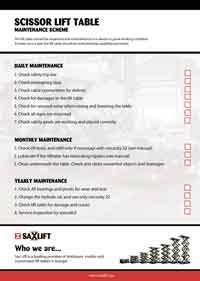 Gehen Sie sorgsam mit Ihrem Hubtisch um - überprüfen Sie täglich die Funktion der Sicherheitsauslösung und werfen Sie die Handbedienung nicht herum oder brechen Sie sie auf andere Weise. Halten Sie sich an den täglichen, monatlichen und jährlichen Wartungsplan, der in der Betriebsanleitung zu finden ist. Wenn Sie einen Fehler an Ihrem Hubtisch vermuten, zögern Sie nicht, Sax Lift oder Ihren Servicepartner zu kontaktieren.
